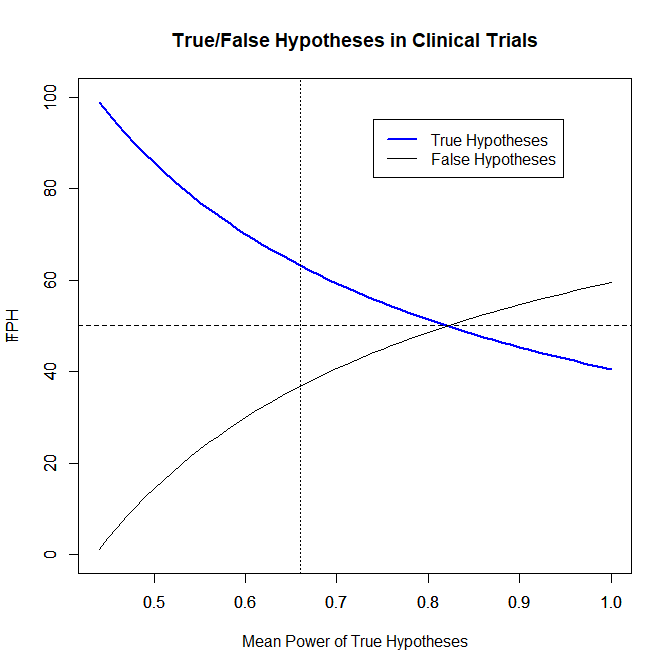 Z-curve also makes it possible to estimate the proportion of true and and false hypotheses that were tested. Once more, these estimates rely on the observable discovery rate and assumptions about the average power of studies that test true hypotheses. Figure 2 shows the percentage of true and false hypotheses for different levels of power. With 80% power, the ratio of true and false hypotheses is 1:1. With the estimated power of 67%, the ratio is about 3:2. Thus, there is no evidence that clinical trials test many more false than true hypotheses.
