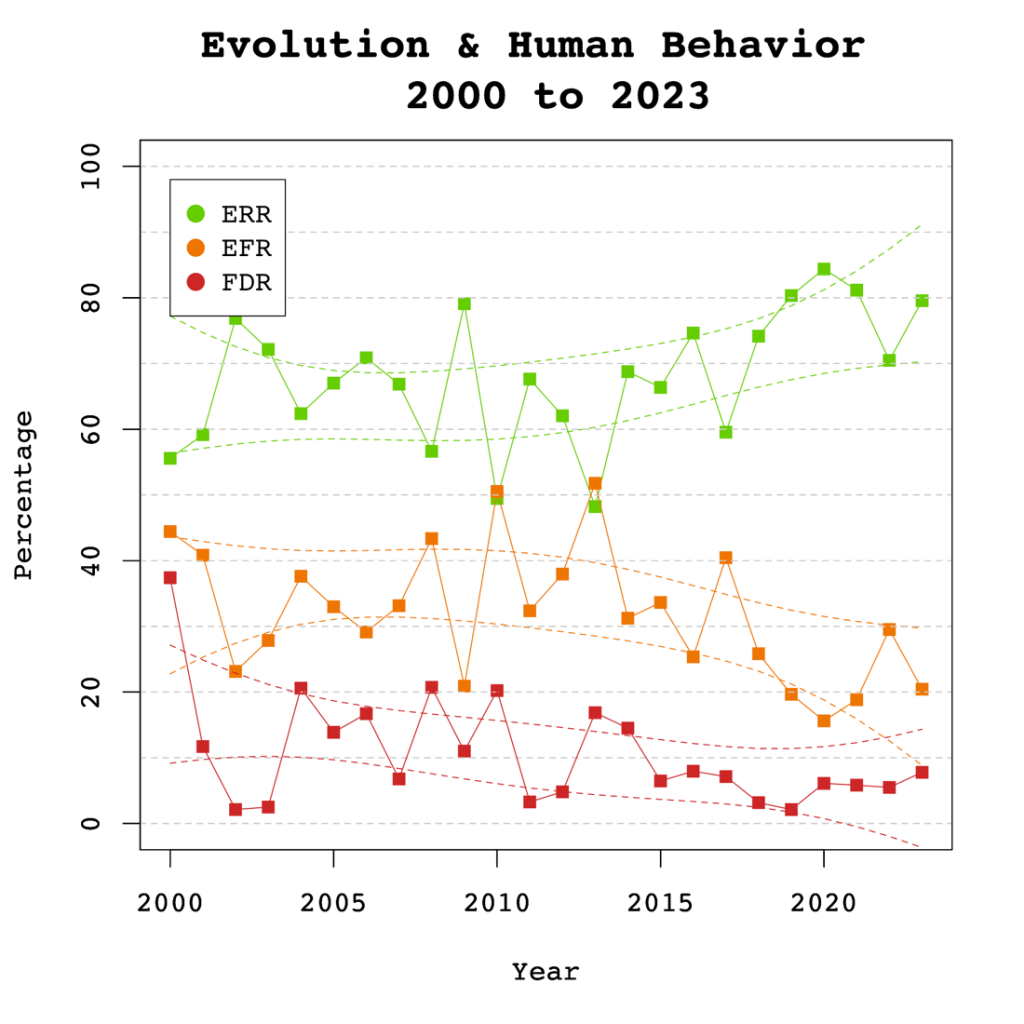 Visual inspection of Figure 4 depicts the EFR higher than the FDR over time, suggesting that replication failures of studies in Evolution & Human Behavior are more likely to be false negatives rather than false positives. Up to 30% of the published results might not be replicable, and up to 50% of those results may be false positives.