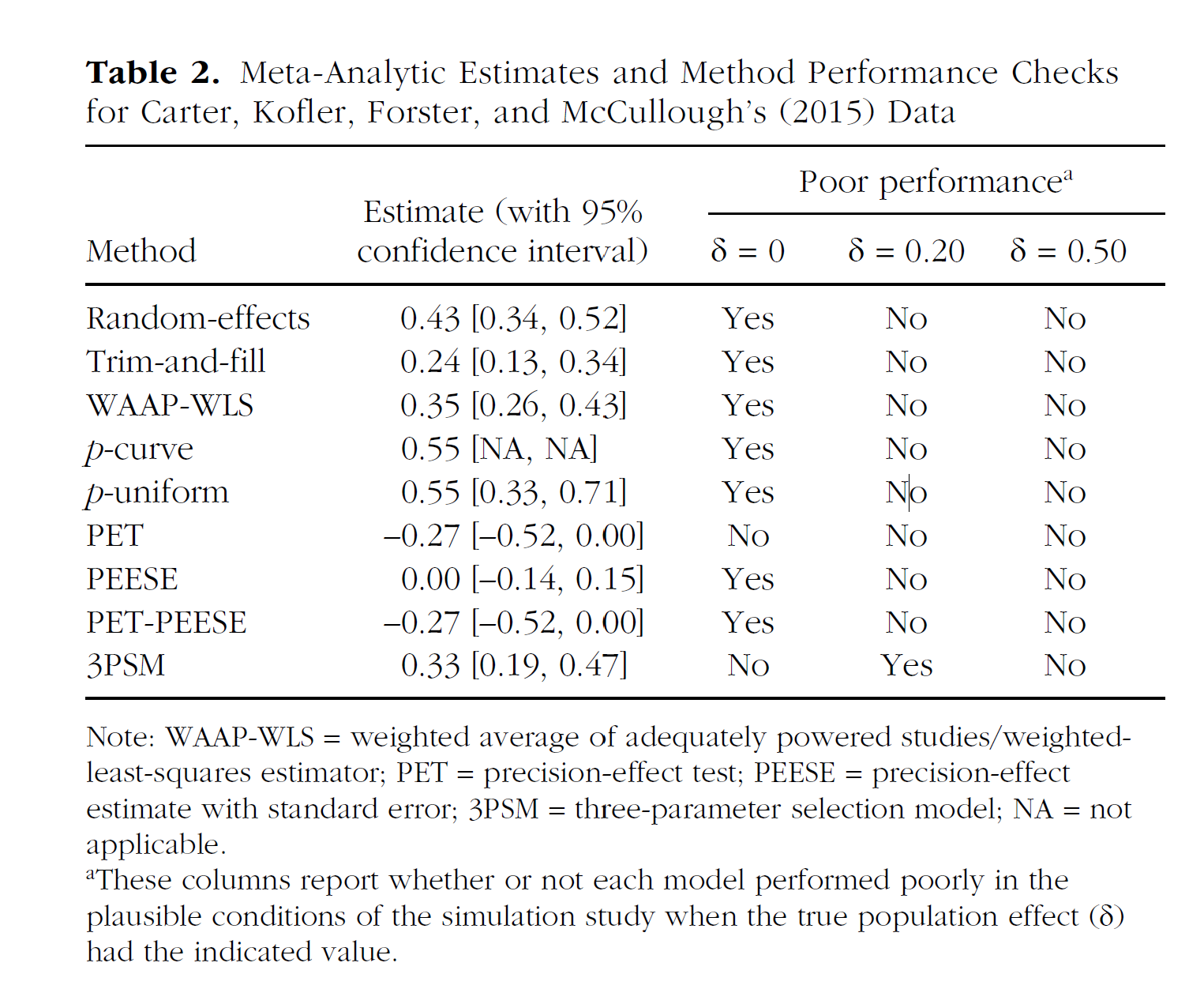 However, Carter et al. (2019) used their simulation studies to suggest that PET-PEESE results are the most trustworthy results because PET-PEESE showed the best performance in simulations without a real effect. Thus, the finding that PET-PEESE did not show a positive effect, while the other models showed one, was interpreted as evidence that the average effect size is probably zero, and implicitly as evidence that estimates of the other models are false rejections of a true null hypothesis.