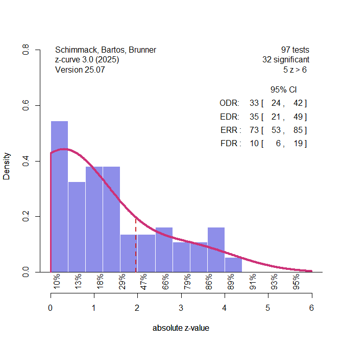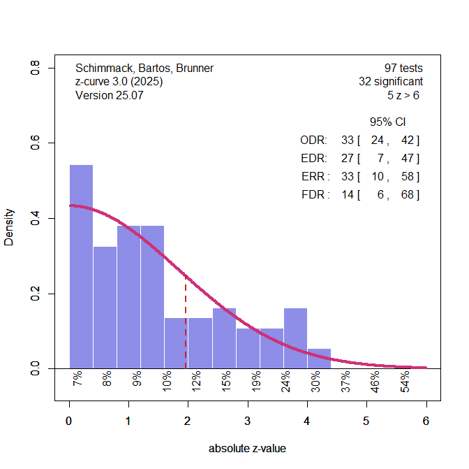 Z-curve.3 provides a simple test of bias that showed evidence of bias in the original studies (Chapter 2). This test assumes that there is no bias (the null-hypothesis). Under this assumption, z-curve is fitted to all z-values, not just significant ones. Bias will produce too many just significant results. The default range for just significant results is 2 to 2.6 (about p = .05 to .01).