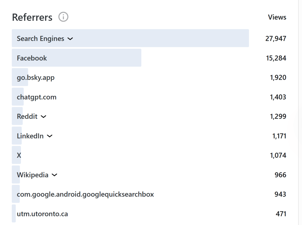 The main prediction is that traffic from ChatGPT and China will increase. Possibly, traffic from other AIs like Gemini will also emerge. Other developments are harder to predict and that is the fun of blogging. I don’t have to invest months of my limited remaining life span to fight stupid reviewers to be allowed to pay $3,000 or more of Canadian tax-payers money to share my work with the world. I can do so for free and just see whether somebody found the work interesting. Fortunately, I am paid well enough so that I do not have to worry about the incentive structure in academia that everybody knows leads to fast, cheap, and bad science, but nobody is able to change. For those of you who are still a cog in this mindless machine, I can say there is hope. The tyranny of publication cartels is weakening and maybe sometimes it is better to just post a preprint than to try the 10th journal for the stamp of approval in a peer-reviewed (predatory) journal. Academia is a long game. The rewards come at the end when you can do what you want without concerns about approval. Humanist psychologists call this self-actualization. I call it the freedom of not giving a fuck anymore.