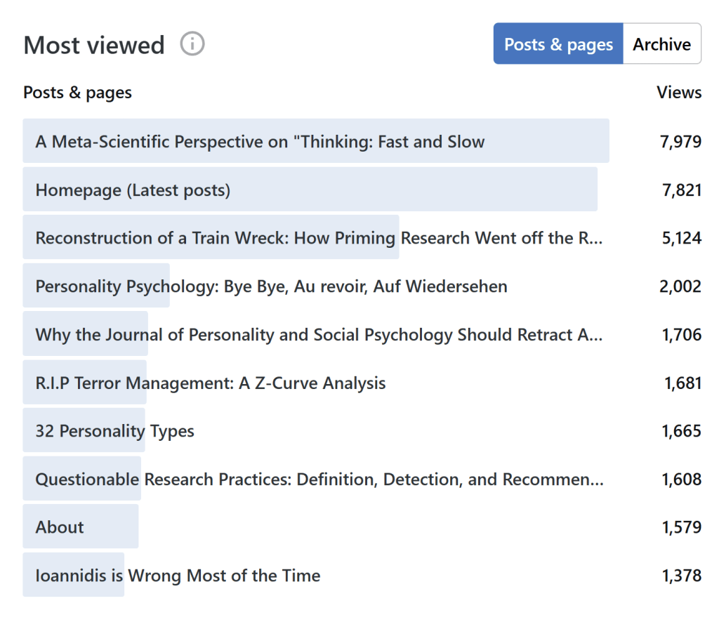 The posts about “Fast and Slow” are still the most viewed pages. Reconstruction of a train wreck is home to Kahneman’s humble response to the z-curve analysis of the priming chapter, but the “Meta-Scientific Perspective” post is a review of all chapters.