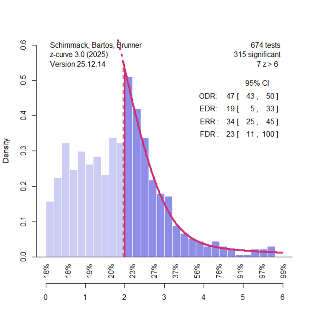 The full z-curve analysis fits a statistical model to the distribution of z-values. Studies with low power—due to small effect sizes, small sample sizes, or both—are likely to produce low z-values and often nonsignificant results (z = 1.96 ≈ p = .05). Studies with high power (e.g., 80% power corresponds to z ≈ 2.8) require either moderate-to-large effect sizes or very large sample sizes. Inspection of the plot shows that most studies cluster at low z-values, with relatively few studies producing z-values greater than 2.8. Thus, even before modeling the data, the distribution indicates that the literature is dominated by low-powered studies.