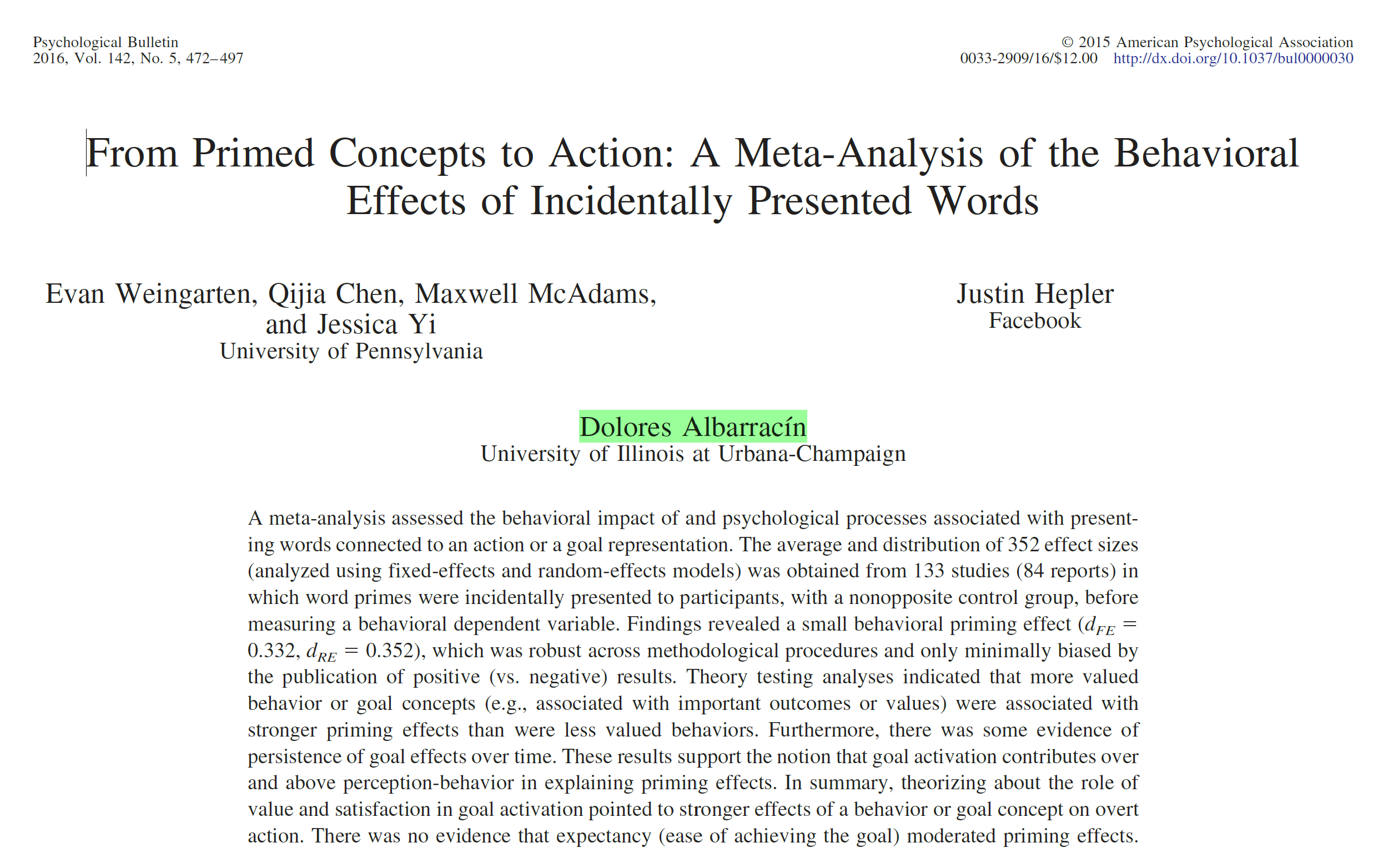 In 2016, Albarracín (as senior author) and colleagues published a meta-analysis concluding that social priming effects exist, although the average effect size was relatively small (d ≈ .30; Weingarten et al., 2016). An effect of this magnitude corresponds to roughly one-third of a standard deviation, which is modest in behavioral terms.