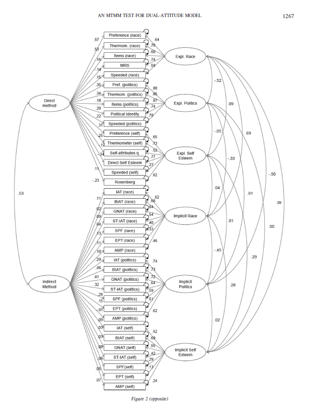 The data were analyzed using structural equation modeling with MPLUS8.2 (Muthen & Muthen (2017), A multi-group model was specified with African Americans and White Americans as separate groups. The model was developed iteratively using the data. Thus, all results are exploratory and require validation in a separate sample. Due to the small number of Black participants, it was not possible to cross-validate the model with half of the sample. Moreover, tests of group differences have low power and a study with a larger sample of African Americans is needed to test equivalence of parameters. Cherry picking of data, models, and references undermines psychological science. To avoid this problem, we also constructed a model that assumes some implicit measures are biased and inflate in-group attitudes of African Americans. To identify the means of the latent in-group and out-group factors, we chose the single-target IAT because it shows the least positive attitudes of African Americans towards their in-group. We then freed other parameters to maximize model fit. We then freed other parameters to maximize model fit. The data, input syntax, and the full outputs have been posted online (https://osf.io/rvfz8/).
