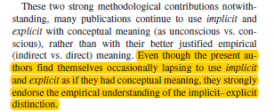 Hofmann, W., Gawronski, B., Geschwendner, T., Le, H., & Schmitt, M. (2005). A meta-analysis on the correlation between the Implicit Association Test and explicit self-report measures. Personality and Social Psychology Bulletin, 31, 1369–1385. doi:10.1177/0146167205275613