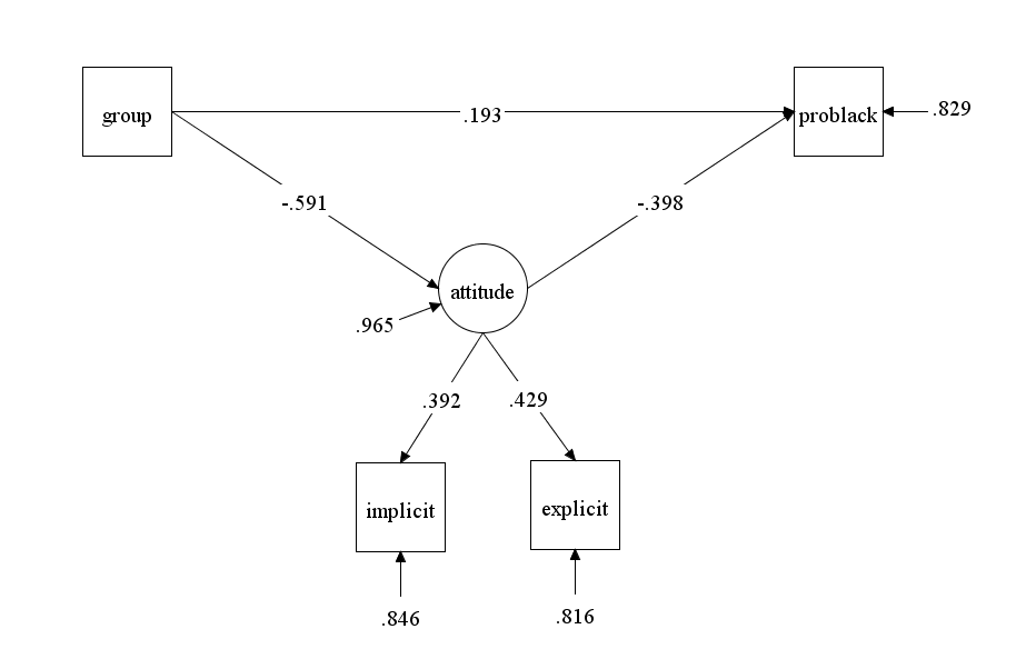 The data were analyzed using structural equation modeling with MPLUS8.2 (Muthen & Muthen (2017), A multi-group model was specified with African Americans and White Americans as separate groups. The model was developed iteratively using the data. Thus, all results are exploratory and require validation in a separate sample. Due to the small number of Black participants, it was not possible to cross-validate the model with half of the sample. Moreover, tests of group differences have low power and a study with a larger sample of African Americans is needed to test equivalence of parameters. Cherry picking of data, models, and references undermines psychological science. To avoid this problem, we also constructed a model that assumes some implicit measures are biased and inflate in-group attitudes of African Americans. To identify the means of the latent in-group and out-group factors, we chose the single-target IAT because it shows the least positive attitudes of African Americans towards their in-group. We then freed other parameters to maximize model fit. We then freed other parameters to maximize model fit. The data, input syntax, and the full outputs have been posted online (https://osf.io/rvfz8/).