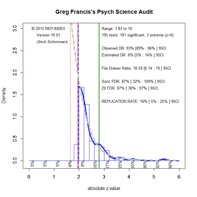 A more valid criticism of Francis’s bias analyses is that they do not reveal the amount of bias (Simonsohn, 2013). That is, when we see 95% significant results in a journal and there is bias, it is not clear whether mean power was 75% or 25%. To be more useful, bias tests should also provide information about the amount of bias.