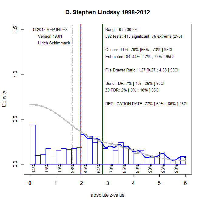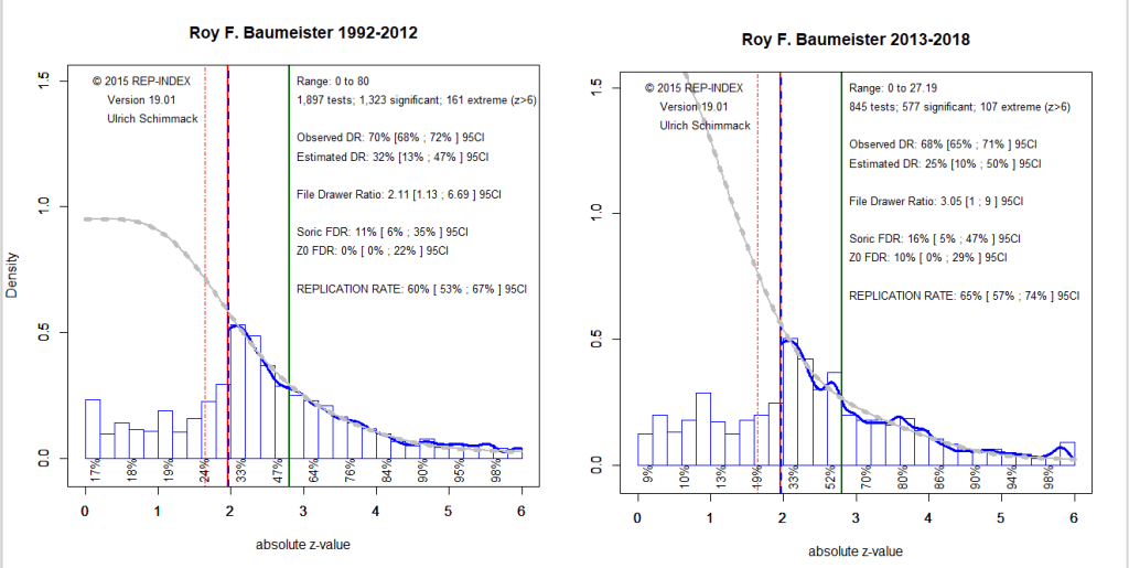 Roy F. Baumeister’s replication rate was 60% (53% to 67%) before 2012 and 65% (57% to 74%) after 2012. The overlap of the 95% confidence intervals indicates that this small increase is not statistically reliable. Before 2012, the observed discovery rate was 70% and it dropped to 68% after 2012. Thus, there is no indication that non-significant results are reported more after 2012. The expected discovery rate was 32% before 2012 and 25% after 2012. Thus, there is also no change in the expected discovery rate and the expected discovery rate is much lower than the observed discovery rate. This discrepancy shows that QRPs were used before 2012 and after 2012. The 95%CI do not overlap before and after 2012, indicating that this discrepancy is statistically significant. Figure 1 shows the influence of QRPs when the observed non-significant results (histogram of z-scores below 1.96 in blue) is compared to the model prediction (grey curve). The discrepancy suggests a large file drawer of unreported statistical tests.