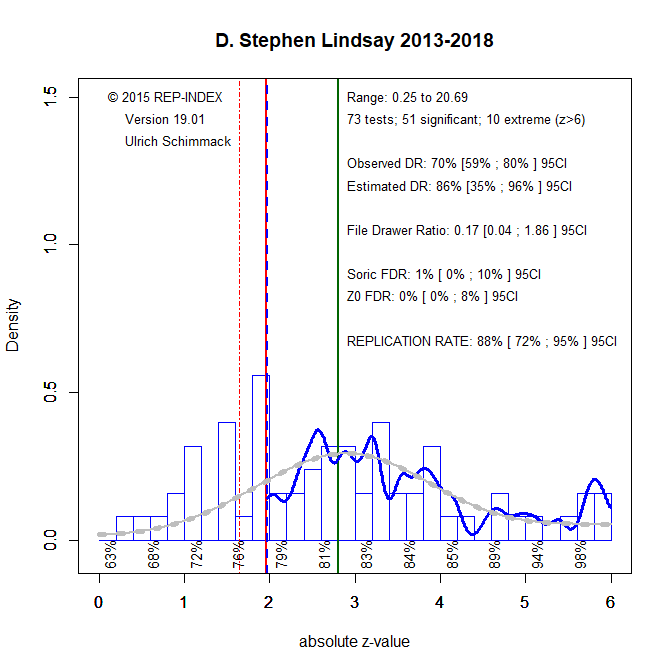 The results should not be overinterpreted. They are estimates based on an objective statistical procedure, but no statistical method can compensate perfectly for the various practices that led to the observed distribution of p-values (transformed into z-scores). However, in the absence of any information which results can be trusted, these graphs provide some information. How this information is used by consumers depends ultimately on consumers’ subjective beliefs. Information about the average replicability of researchers’ published results may influence these beliefs.
