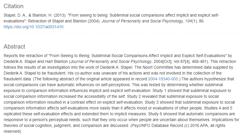 One reason is that not all null findings are interesting. For example, just before his downfall, Stapel published an article on how disordered contexts promote stereotyping and discrimination. In this publication, Stapel and Lindenberg (2011) reported findings showing that litter or a broken-up sidewalk and an abandoned bicycle can increase social discrimination. These findings, which were later retracted, were judged to be sufficiently important and interesting to be published in the highly prestigious journal Science. Let us assume that Stapel had actually conducted the research described in this paper and failed to support his hypothesis. Such a null finding would have hardly merited publication in the Journal of Articles in Support of the Null Hypothesis. It would have been uninteresting for the same reason that made the positive result interesting, namely, that (a) nobody expected a relationship between disordered environments and prejudice and (b) there was no previous empirical evidence for such a relationship. Similarly, if Bargh et al. (1996) had found that priming participants with the stereotype of the elderly did not influence walking speed or if Dijksterhuis and van Knippenberg (1998) had reported that priming participants with “professor” did not improve their performance on a task of trivial pursuit, nobody would have been interested in their findings.