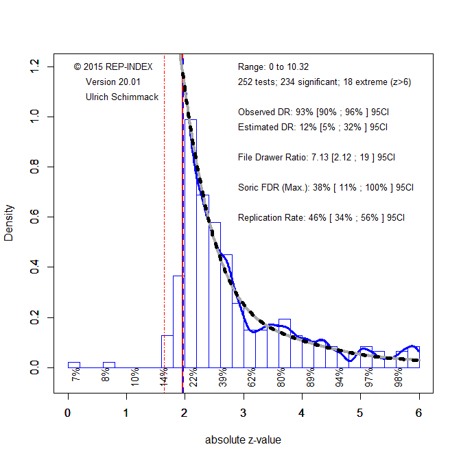 The figure shows the distribution of z-scores. As the book focussed on discoveries most test-statistics are significant with p < .05 (two-tailed, which corresponds to z = 1.96. The distribution of z-scores shows that these significant results were selected from a larger set of tests that produced non-significant results. The z-curve estimate is that the significant results are only 12% of all tests that were conducted. This is a problem.