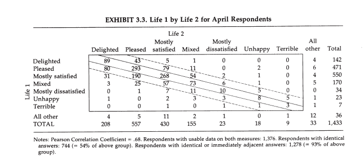 The first notable finding is that the disposition factor accounts for the lion share of the explained variance in life-satisfaction judgments. The second important finding is that the relationship is very stable over time. The disposition measured at time 1 is an equally good predictor of life-satisfaction at time 1 (r = .56), time 2 (r = .59), and at time 3 (r = .57). This suggests that about one-third of the reliable variance in life-satisfaction judgments reflects a stable disposition to report higher or lower levels of satisfaction.