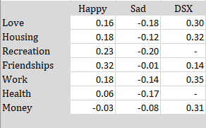 Table 2 examines the influence of top-down processes on domain satisfaction. Results show the factor loadings of domain satisfaction on a common factor that reflects dispositional satisfaction; that is, a general disposition to report higher levels of satisfaction. The results show that somewhere between 30% and 50% of the reliable variance in life-satisfaction judgments is explained by a general disposition factor. While this leaves ample room for domain-specific factors to influence domain satisfaction judgments, the results show a strong top-down influence.
