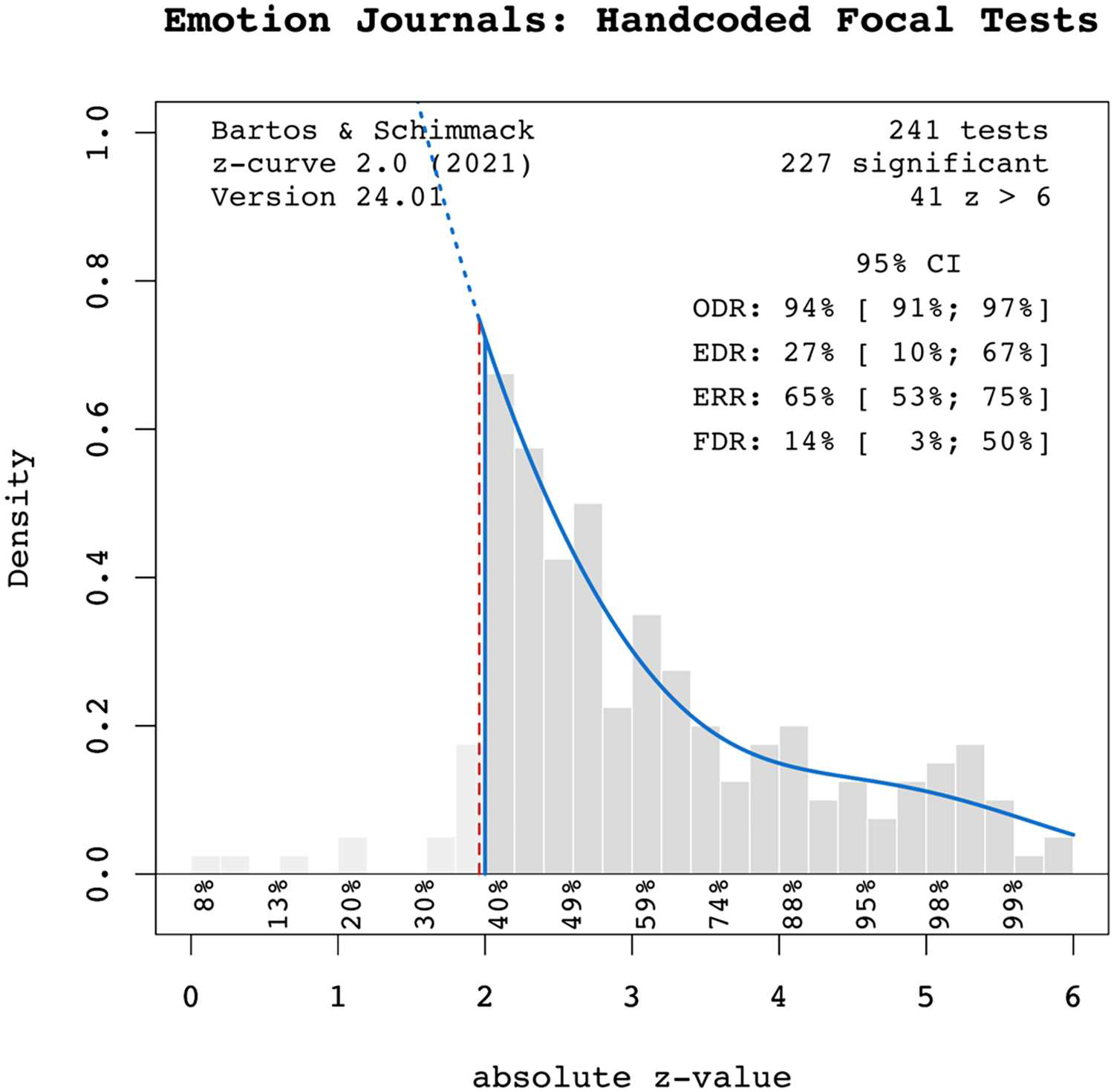 The z-curve plot makes it easy to spot selection for significance because there are many studies with just significant results (z > 2) and no studies with just not-significant results that are often called marginally significant results because they are used in publications to reject the null hypothesis with a relaxed criterion. A plot like this cannot be produced by sampling error.