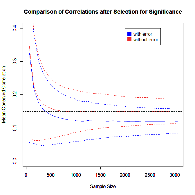Thus, selection for significance inflates observed power of 80% to 86%. The amount of inflation is larger when power is lower. With 20% power, the inflated power after selection for significance is 67%.